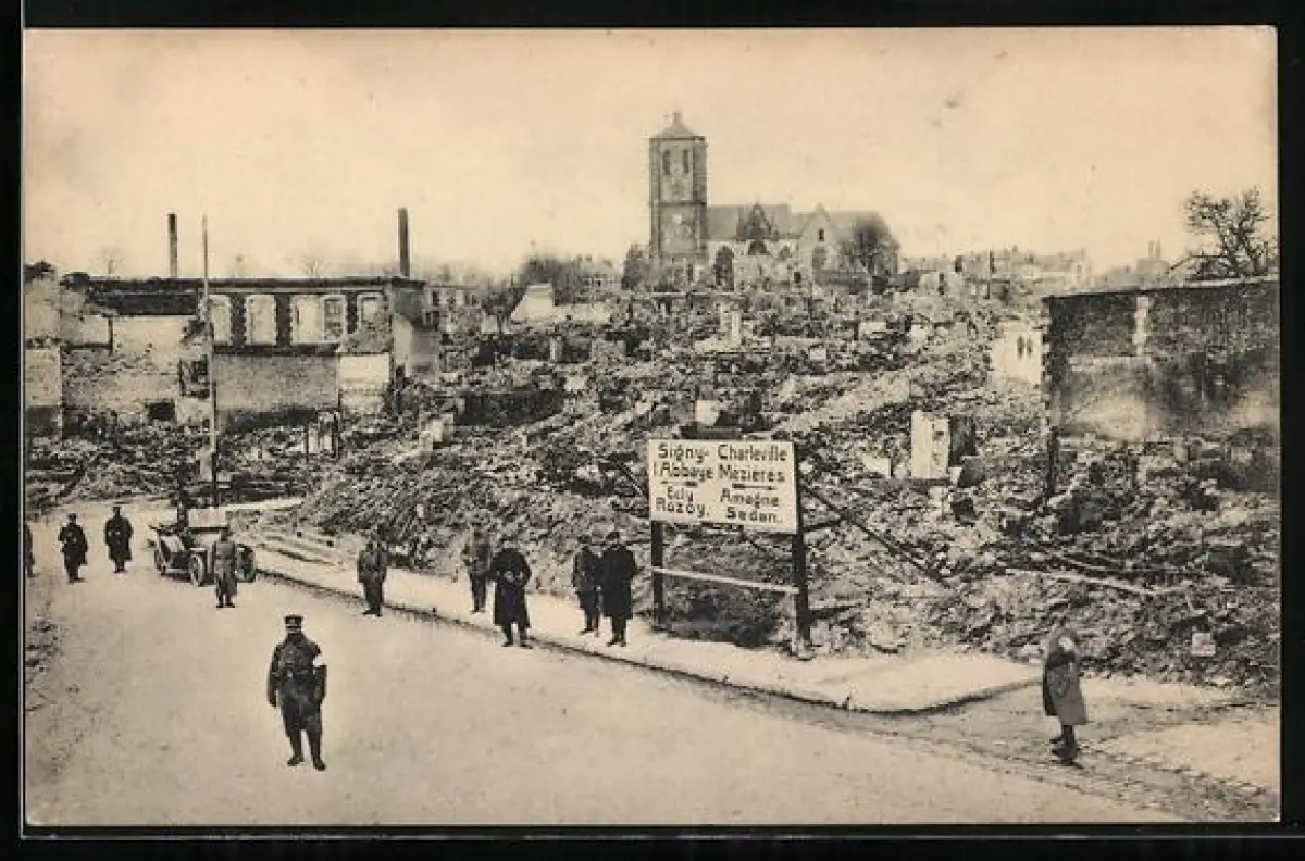 AK Rethel, Ruinen des Ortes, Panorama mit Soldaten und Kirche