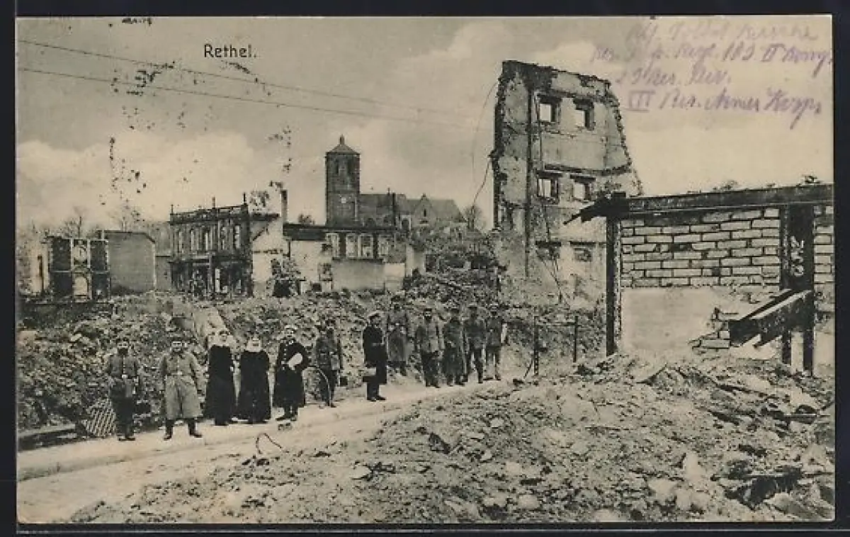 AK Rethel, Scène de rue avec bâtiments détruits et groupe de personnes