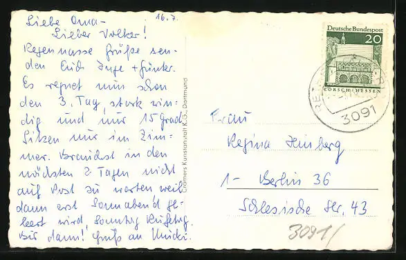 Personenbezogene Daten auf der Rückseite der Karte wurden durch blauen Textmarker unkenntlich gemacht. Die blauen Stellen sind auf die Vorderseite durchgeweicht und wirken sich negativ auf das Postkartenfoto aus