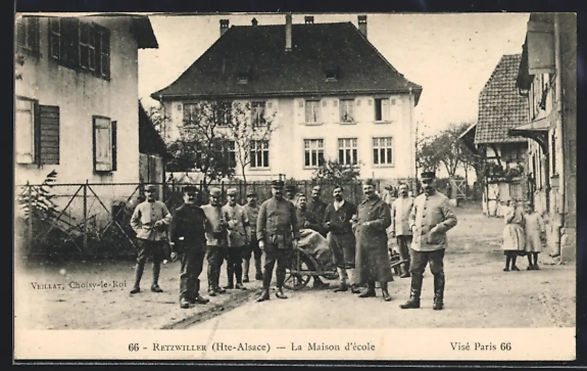 AK Retzwiller /Hte-Alsace, La Maison d`école avec des soldats devant