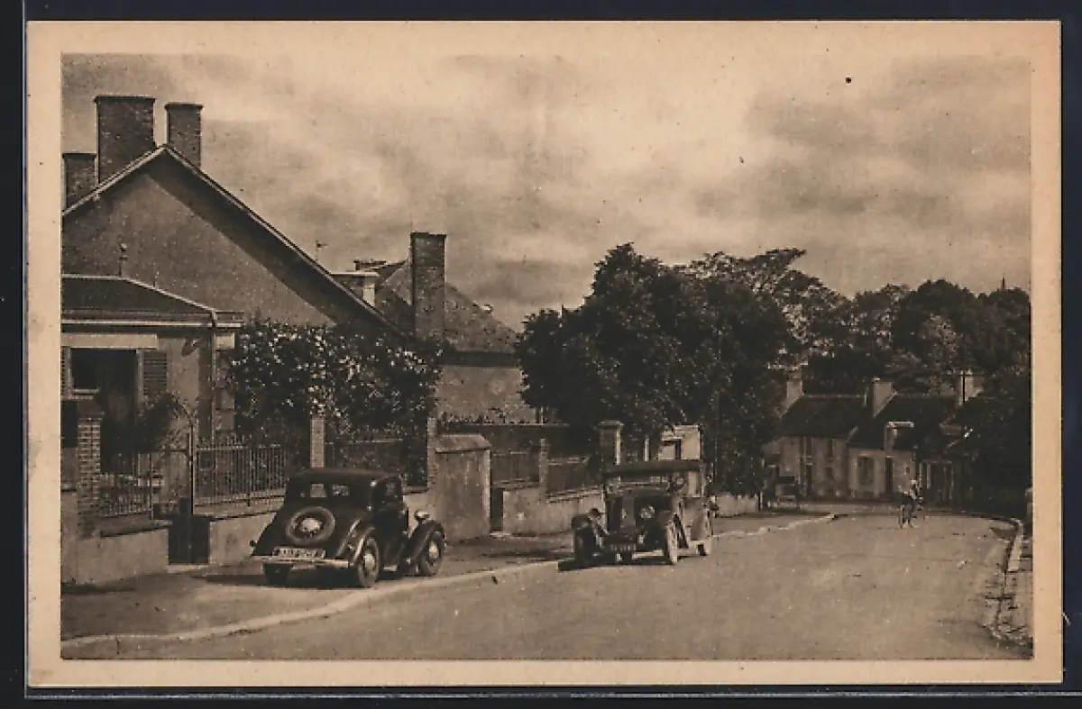 AK Reuilly, Route d`Issoudun avec voitures anciennes et maisons bordant la rue