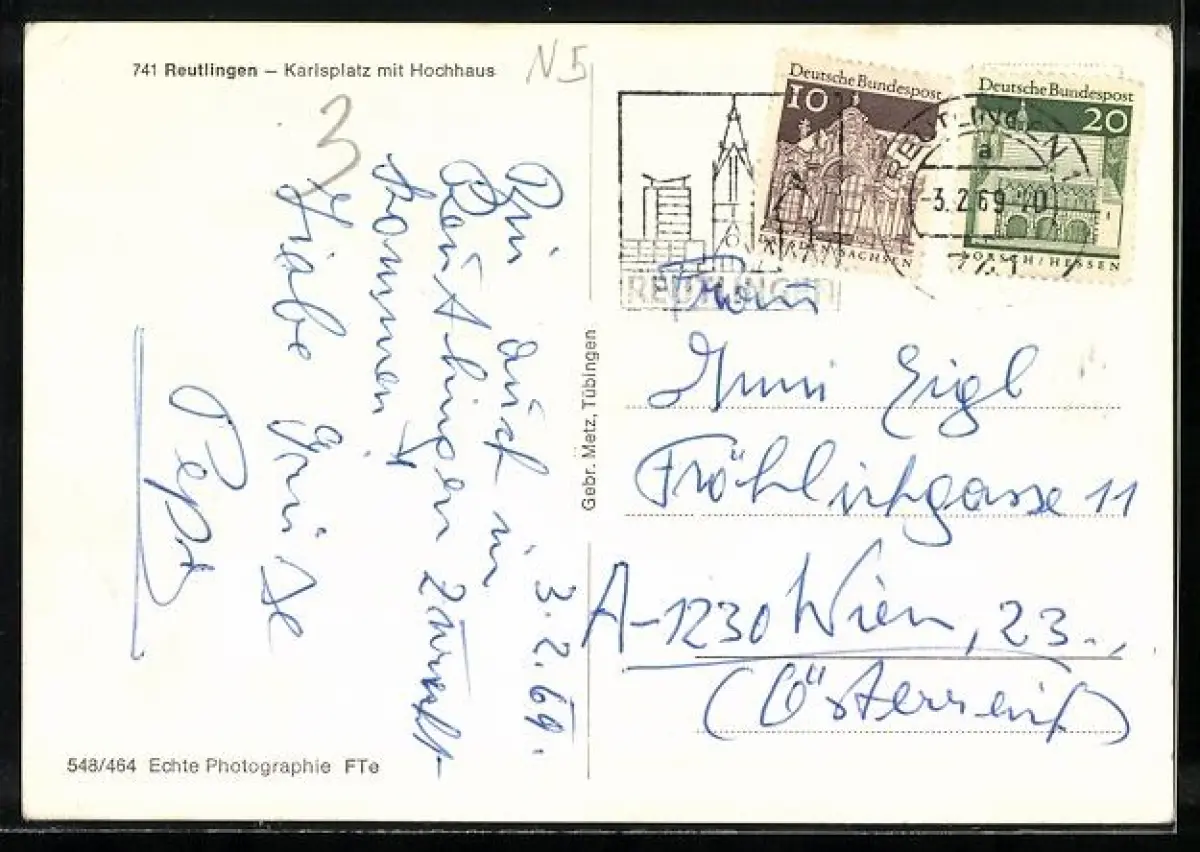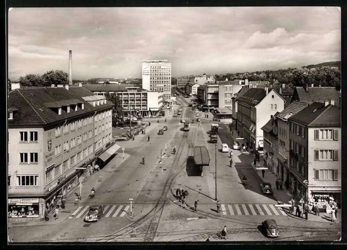AK Reutlingen, Karlsplatz mit Hochhaus aus der Vogelschau