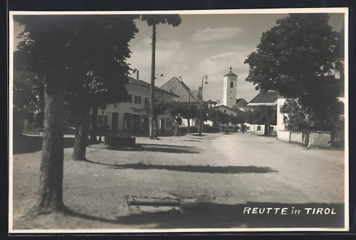 AK Reutte in Tirol, Strassenpartie mit Kirche