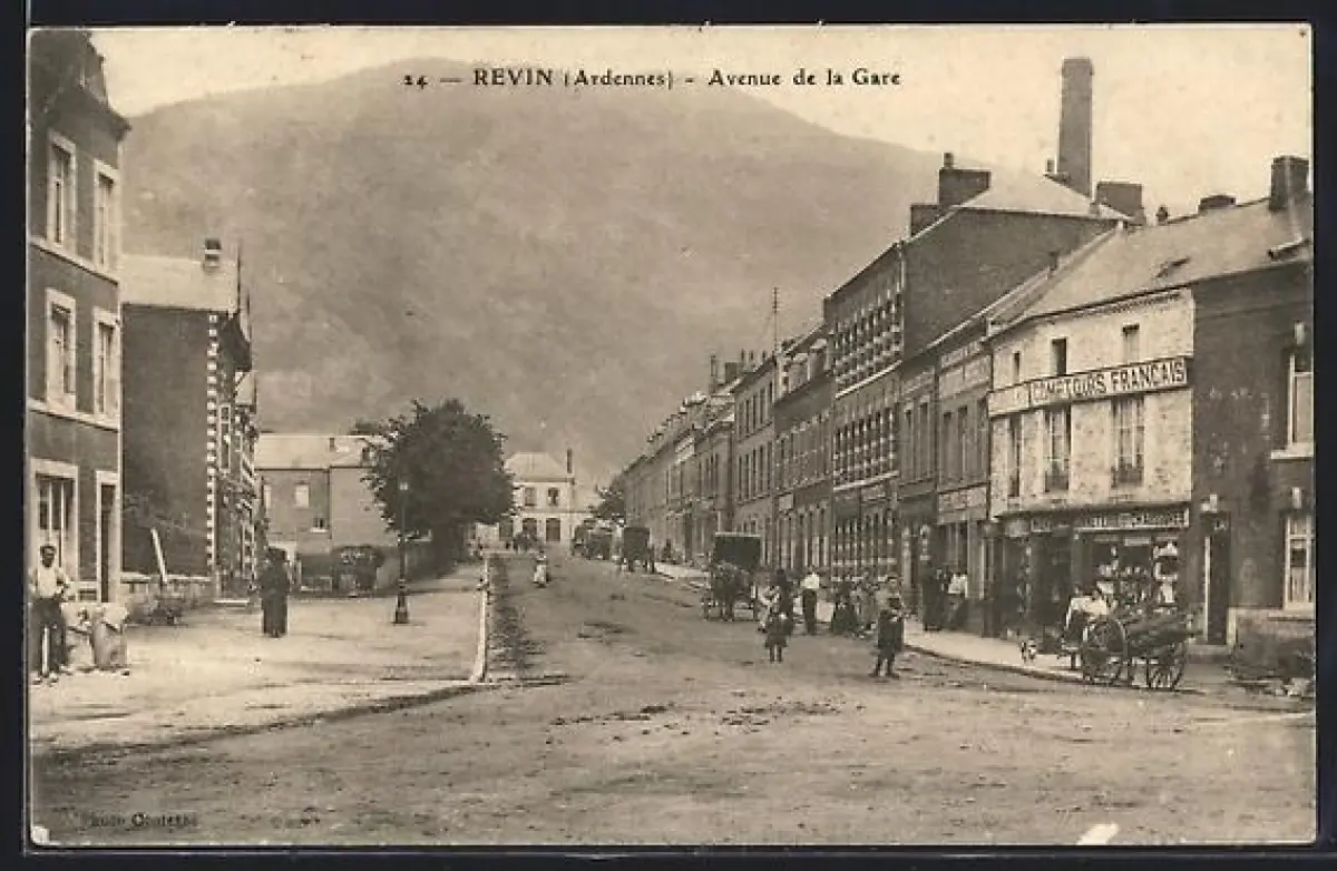 AK Revin /Ardennes, Avenue de la Gare animée avec passants et bâtiments historiques