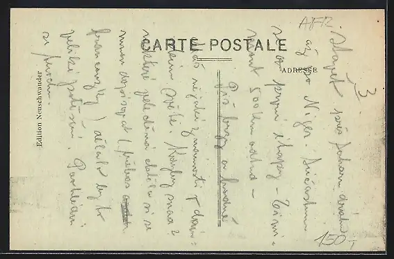 Personenbezogene Daten auf der Rückseite der Karte wurden durch blauen Textmarker unkenntlich gemacht. Die blauen Stellen sind auf die Vorderseite durchgeweicht und wirken sich negativ auf das Postkartenfoto aus