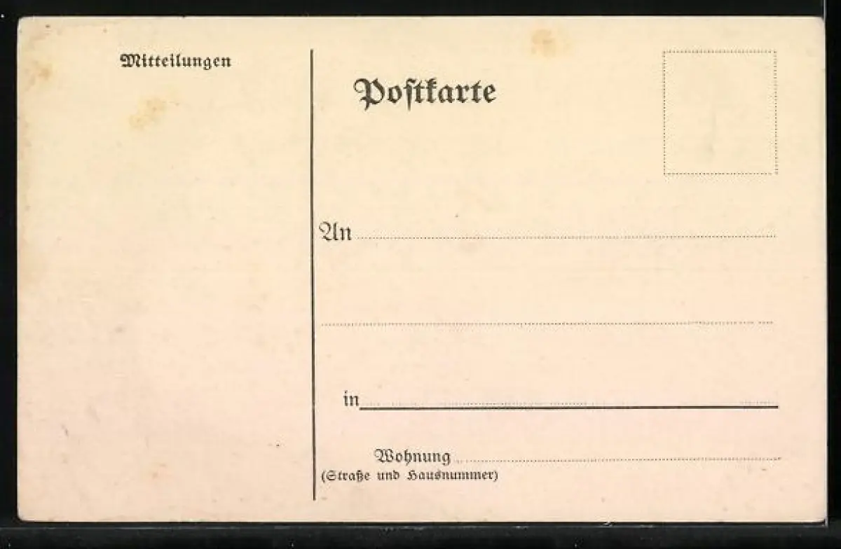 Personenbezogene Daten auf der Rückseite der Karte wurden durch blauen Textmarker unkenntlich gemacht. Die blauen Stellen sind auf die Vorderseite durchgeweicht und wirken sich negativ auf das Postkartenfoto aus