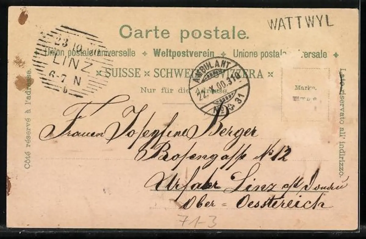 gelaufen 1900, Briefmarke entfernt, rückseitig Oberflächenschaden, Eckknick rechts oben, min. Einriss linke Kante
