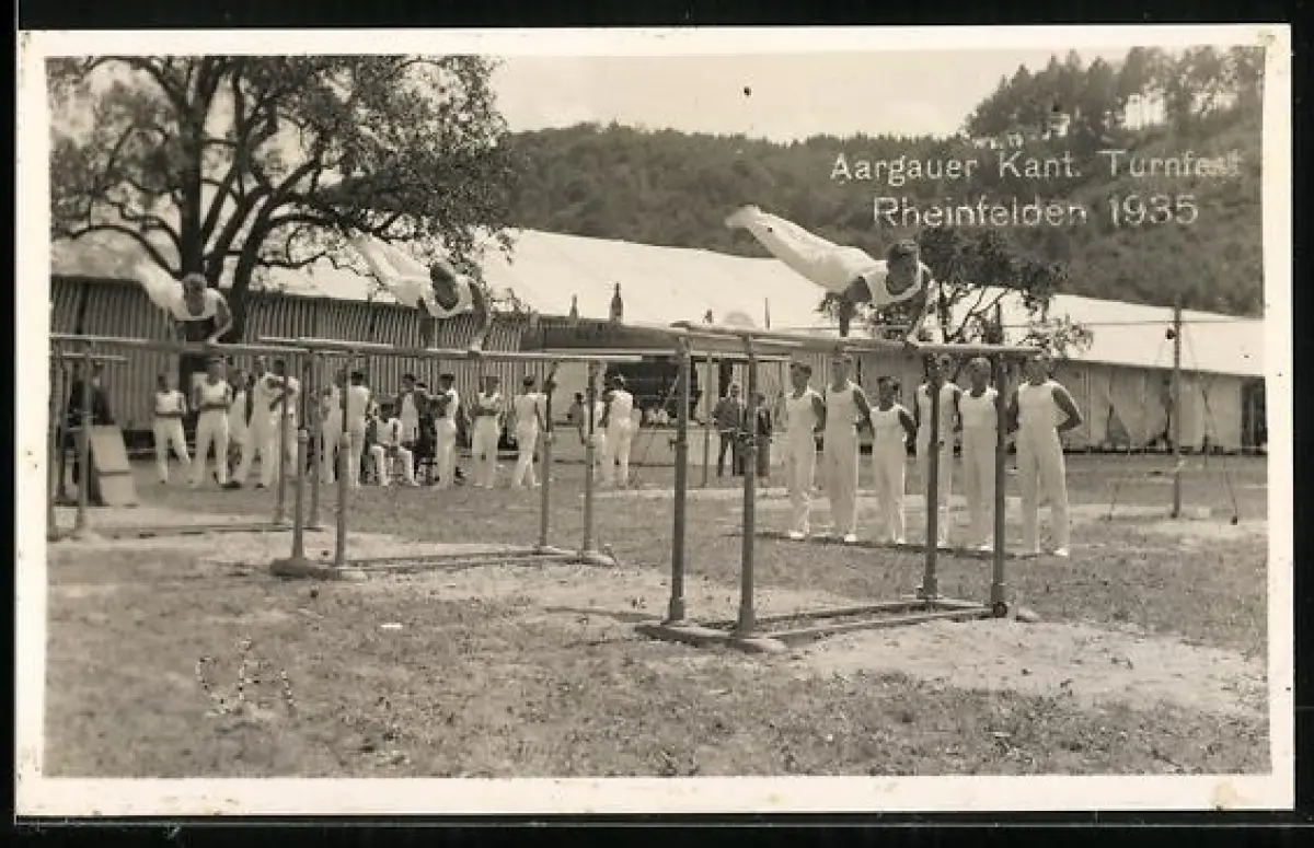 AK Rheinfelden, Aargauer Kant. Turnfest 1935, Turner auf dem Feld vor dem Festzelt