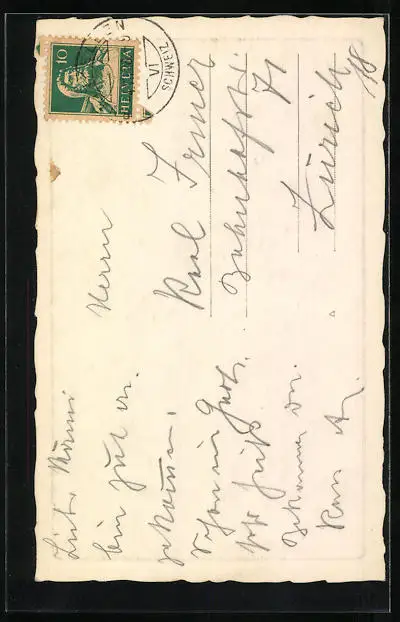 Personenbezogene Daten auf der Rückseite der Karte wurden durch blauen Textmarker unkenntlich gemacht. Die blauen Stellen sind auf die Vorderseite durchgeweicht und wirken sich negativ auf das Postkartenfoto aus
