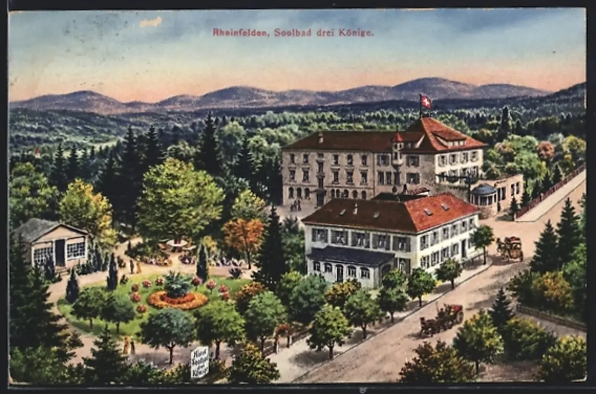 AK Rheinfelden, Soolbad Drei Könige mit Anlagen, Strasse und Bergpanorama
