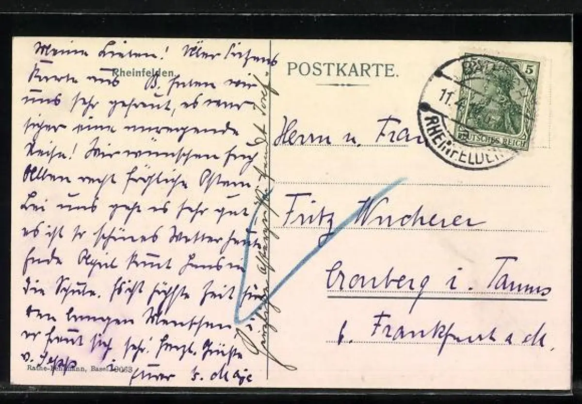 Personenbezogene Daten auf der Rückseite der Karte wurden durch blauen Textmarker unkenntlich gemacht. Die blauen Stellen sind auf die Vorderseite durchgeweicht und wirken sich negativ auf das Postkartenfoto aus