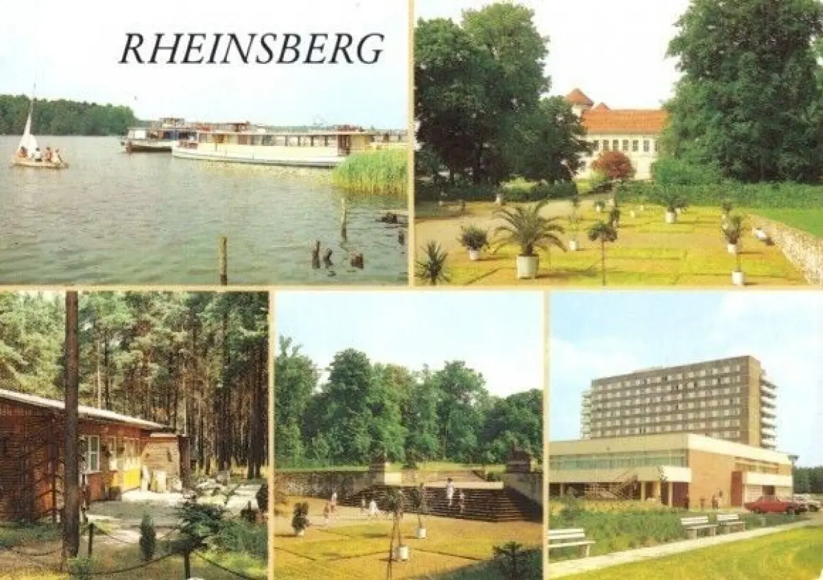 Ansichtskarte Rheinsberg Kr. Neuruppin 5 Abb., Schiffsanlegestelle, Schloßpark, usflugsgaststätte "Waldcafé", Schloßpark, FDGB-Erholungsheim "Ernst Thälmann" Erhaltung II, Ecke oben links leicht bügig postalisch gelaufen, gestempelt: Rheinsberg 1, 24.04.90 Druckvermerk: ohne, um 1990 Herstellungsland: DDR Verlag: Bild und Heimat Reichenbach - 01 04 0672/11