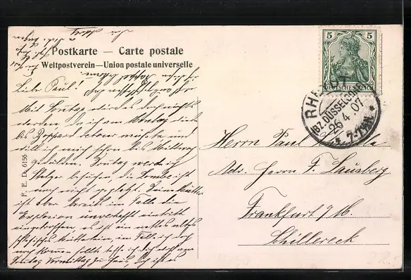alte Ansichtskarte, gelaufen 1907, Bugspur li. unten, guter Zustand