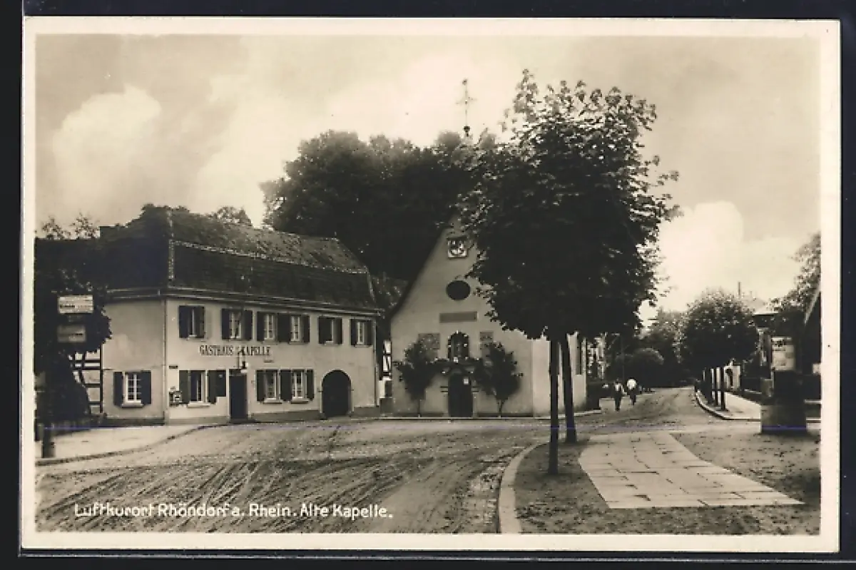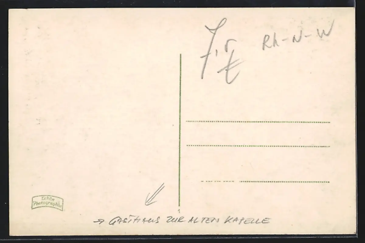 AK Rhöndorf a. Rhein, Gasthaus zur Alten Kapelle mit Strassenbahn, Litfasssäule