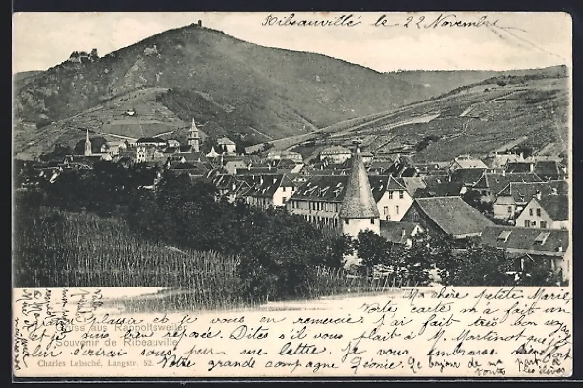 AK Ribeauvillé, Vue du village avec collines et château en arrière-plan
