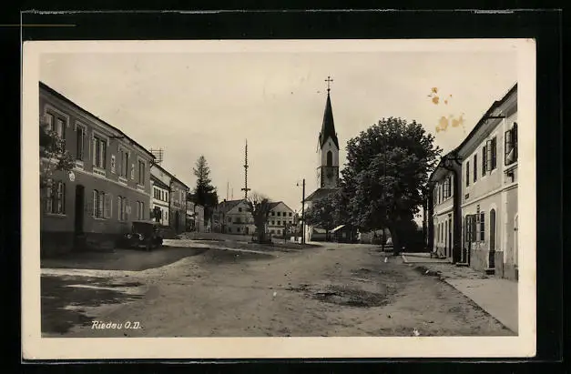 AK Riedau /O.-D., Strassenpartie mit Kirche