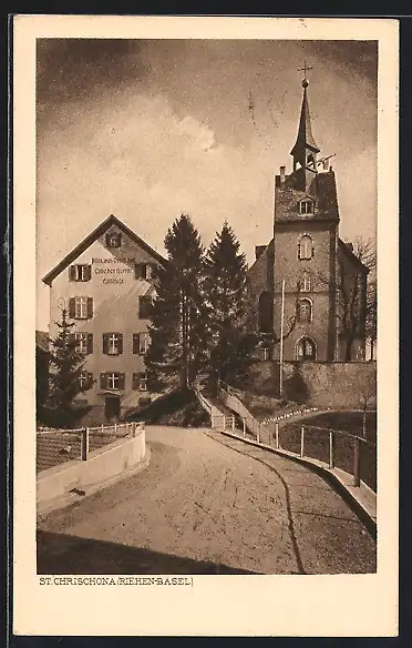 AK Riehen-Basel, Strassenpartie mit Kirche St. Chrischona