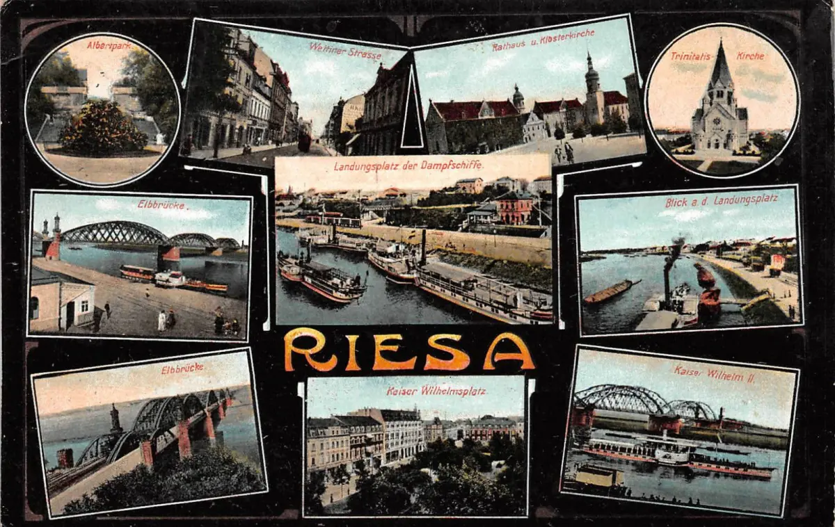 AK Riesa Elbbrücke, Dampfer, Weltiner Strasse, Panorama Postkarte 1916