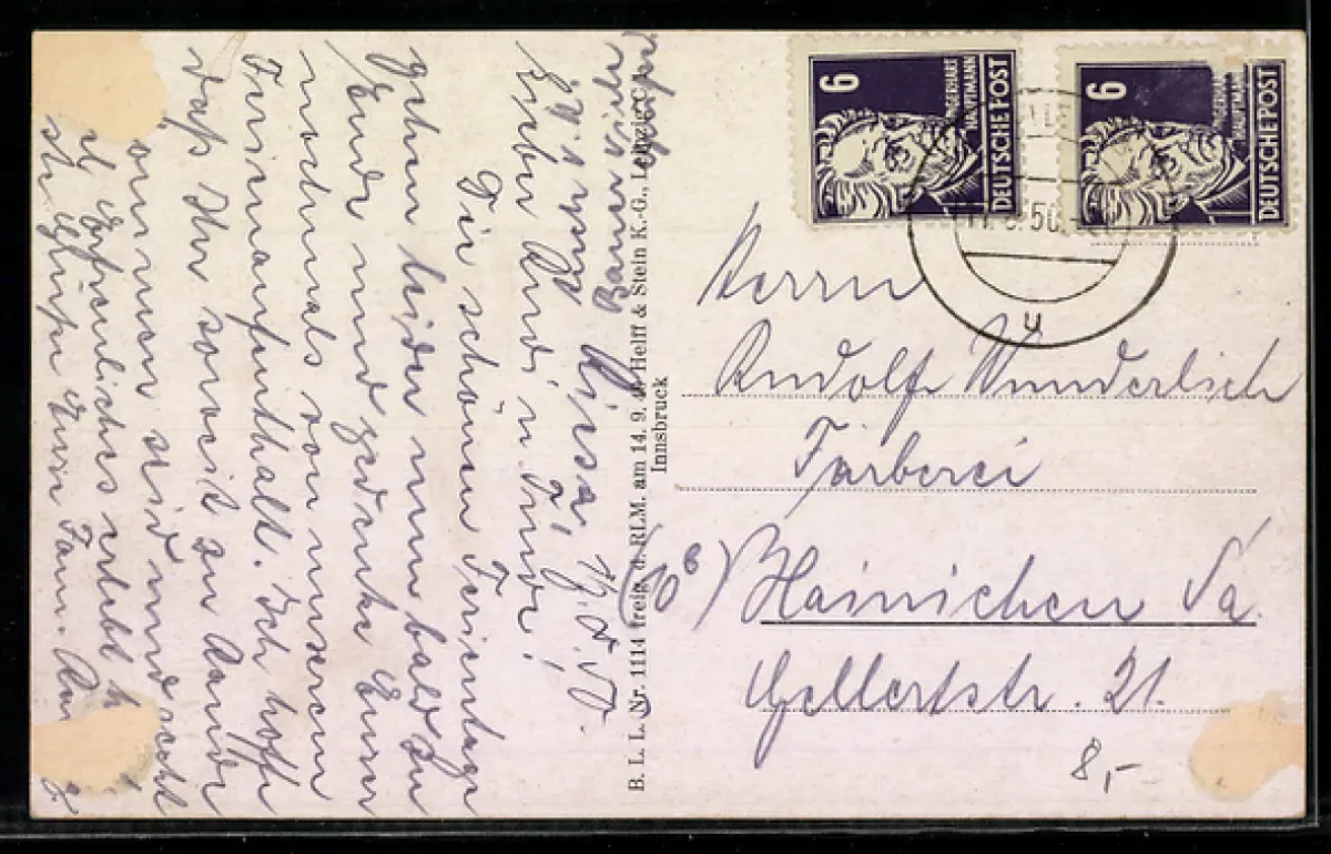 gelaufen 1950, rückseitig Oberflächenschaden, guter Zustand