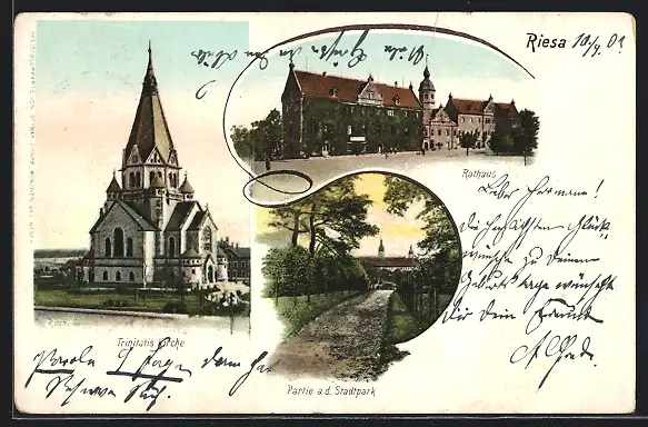 AK Riesa, Rathaus, Trinitatis-Kirche und Partie im Stadtpark