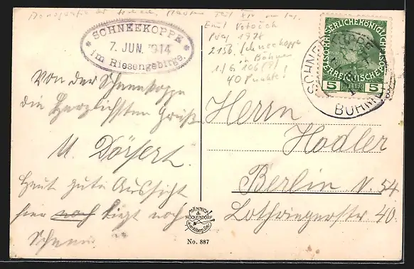 AK Riesenbaude, Ansicht mit Umgebung und Schneekoppe