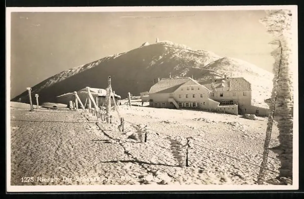 AK Riesenbaude, Berghütte mit Schneekoppe, Riesengebirge