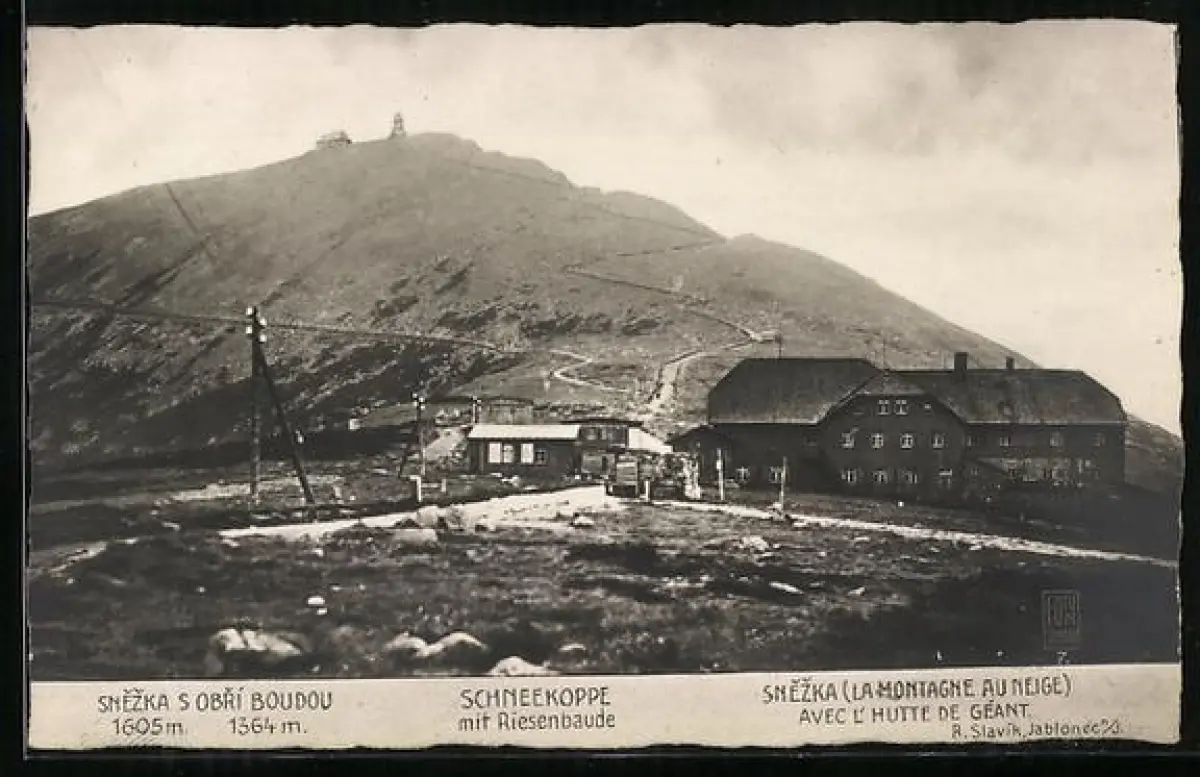 AK Riesenbaude /Schneekoppe, Berghütte mit Blick zur Schneekoppe