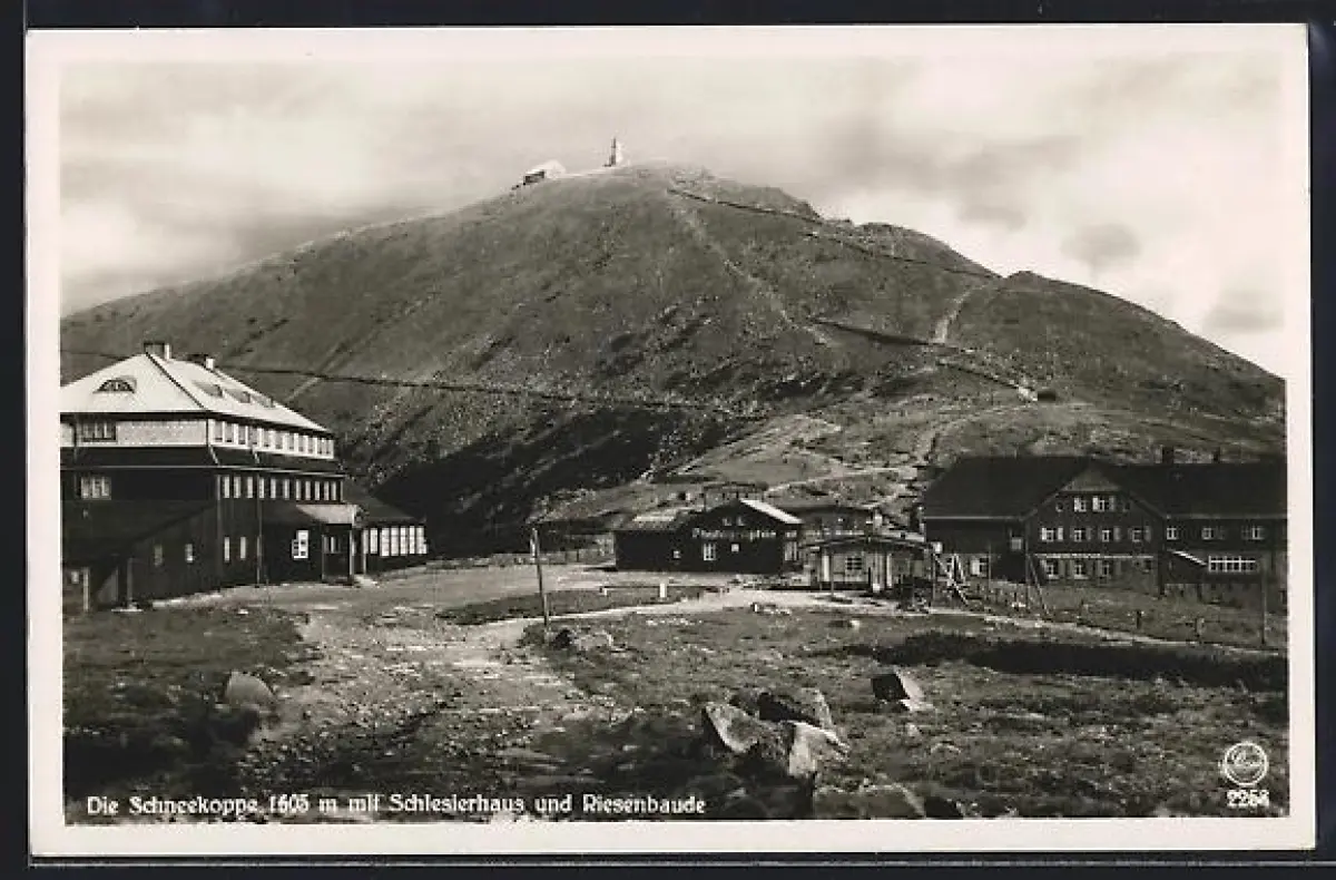 AK Riesenbaude und Schlesierhaus mit Blick zur Schneekoppe