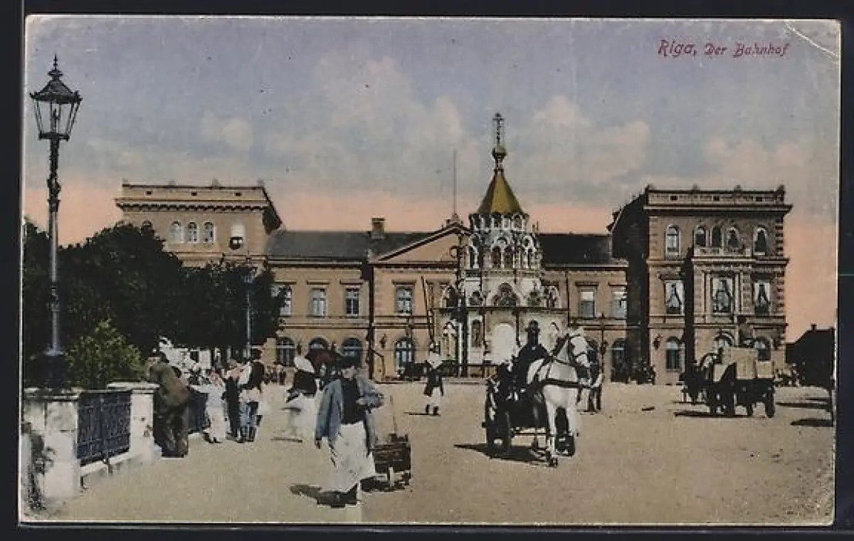 AK Riga, Der Bahnhof, Panorama mit Passanten