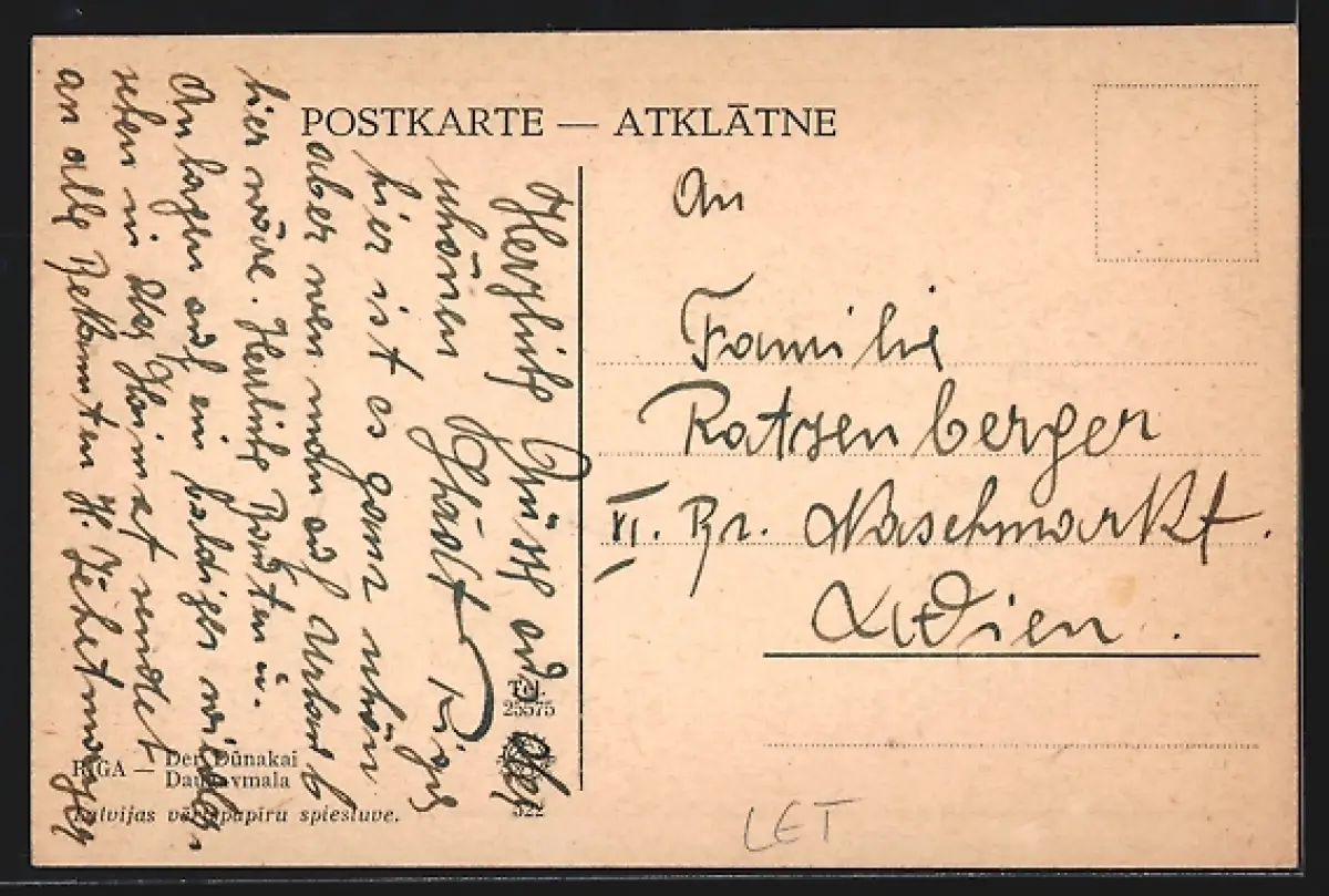 Personenbezogene Daten auf der Rückseite der Karte wurden durch blauen Textmarker unkenntlich gemacht. Die blauen Stellen sind auf die Vorderseite durchgeweicht und wirken sich negativ auf das Postkartenfoto aus