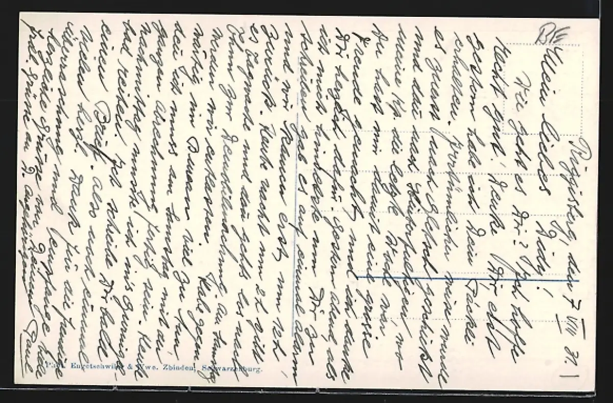 Personenbezogene Daten auf der Rückseite der Karte wurden durch blauen Textmarker unkenntlich gemacht. Die blauen Stellen sind auf die Vorderseite durchgeweicht und wirken sich negativ auf das Postkartenfoto aus