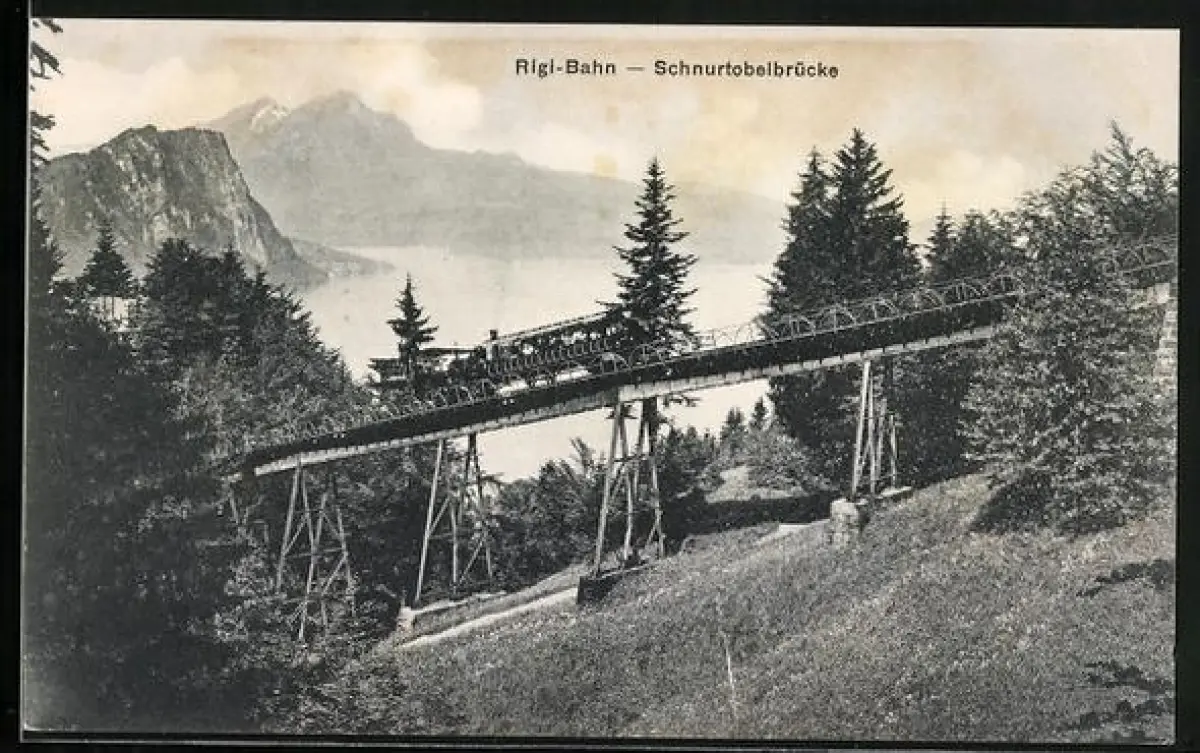 AK Rigi-Bahn passiert die Schnurtobelbrücke, Bergbahn