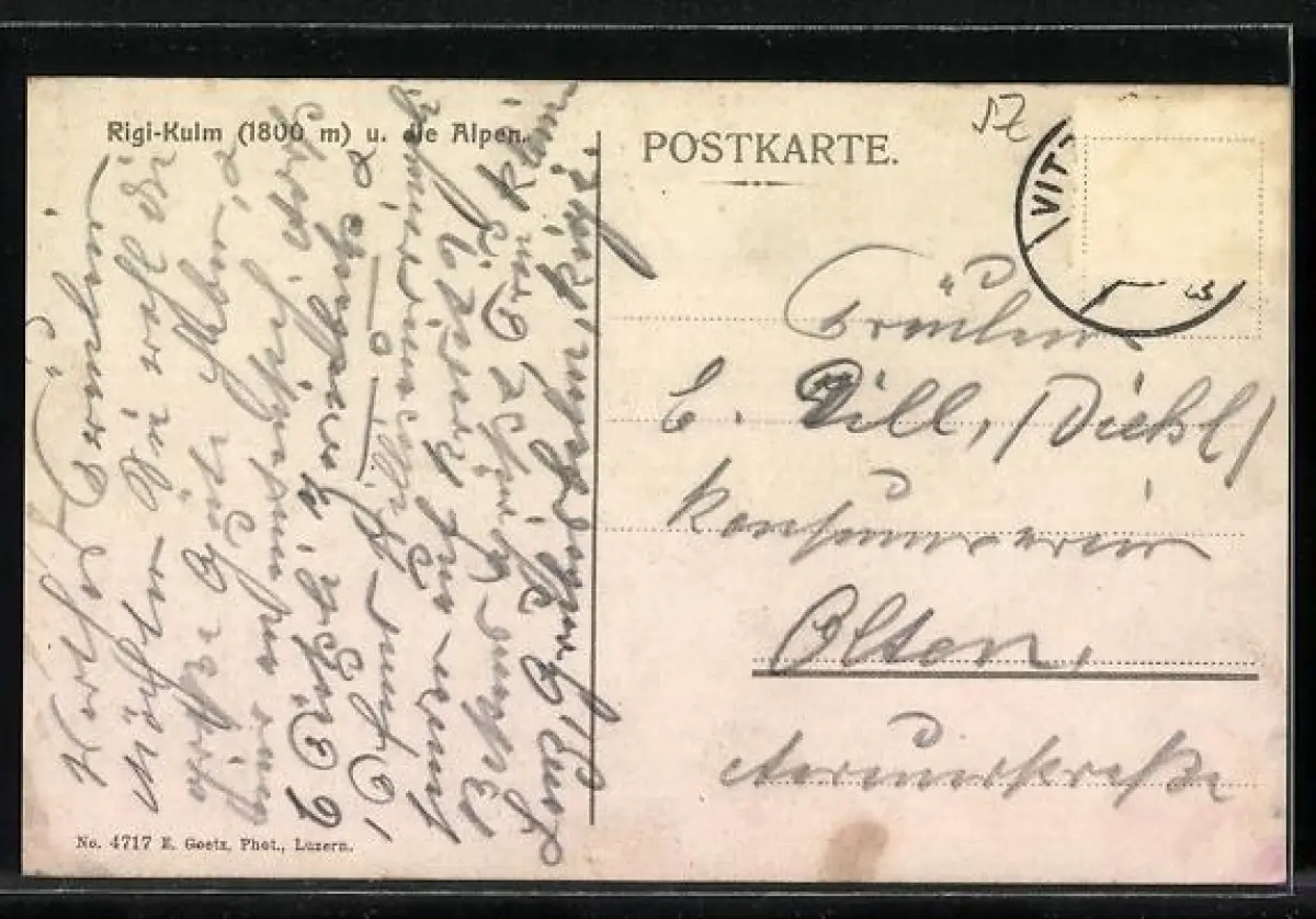 Personenbezogene Daten auf der Rückseite der Karte wurden durch blauen Textmarker unkenntlich gemacht. Die blauen Stellen sind auf die Vorderseite durchgeweicht und wirken sich negativ auf das Postkartenfoto aus