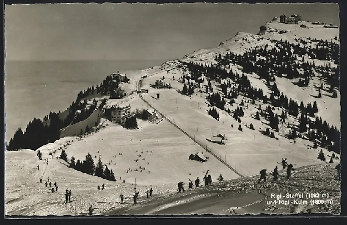 AK Rigi-Staffel, Panorama und Rigi-Kulm mit Skifahrern