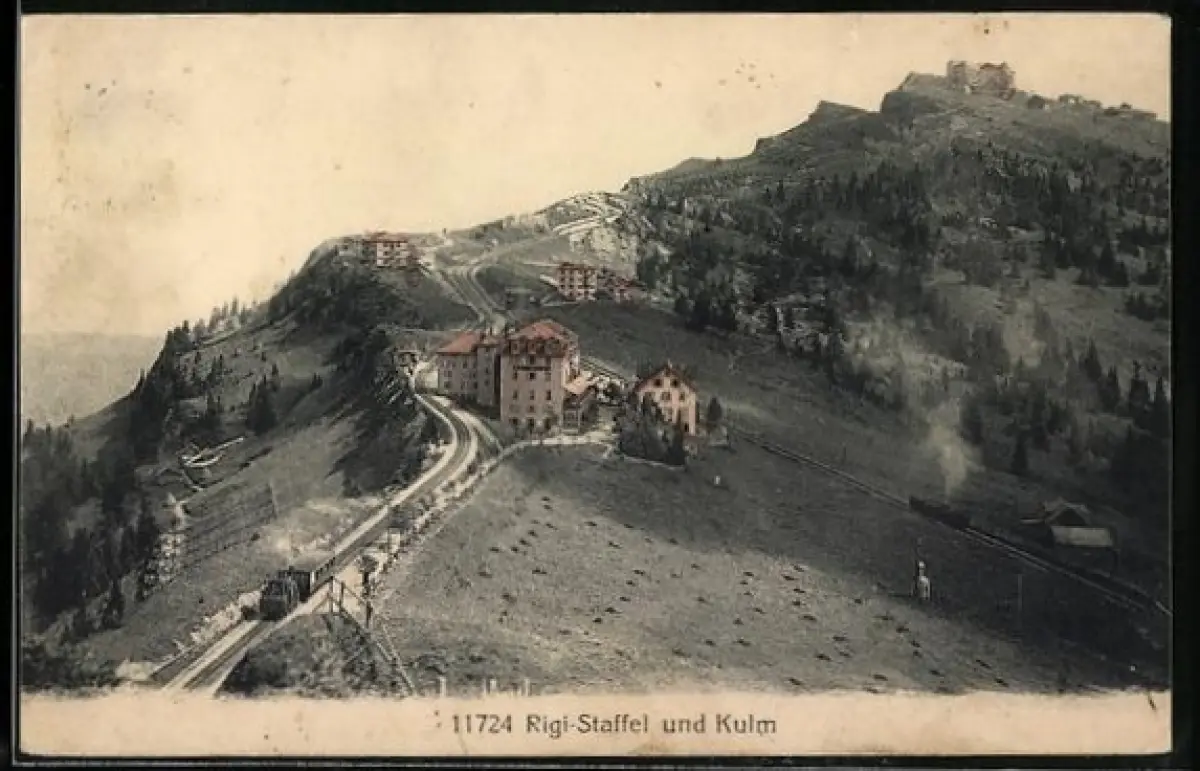 AK Rigibahn, Rigi-Kulm und Rigi-Staffel und Kulm mit Bergbahn aus der Vogelschau