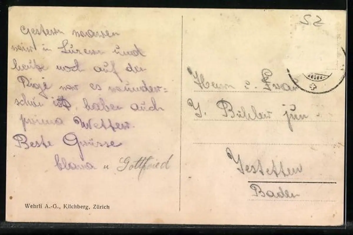 Personenbezogene Daten auf der Rückseite der Karte wurden durch blauen Textmarker unkenntlich gemacht. Die blauen Stellen sind auf die Vorderseite durchgeweicht und wirken sich negativ auf das Postkartenfoto aus