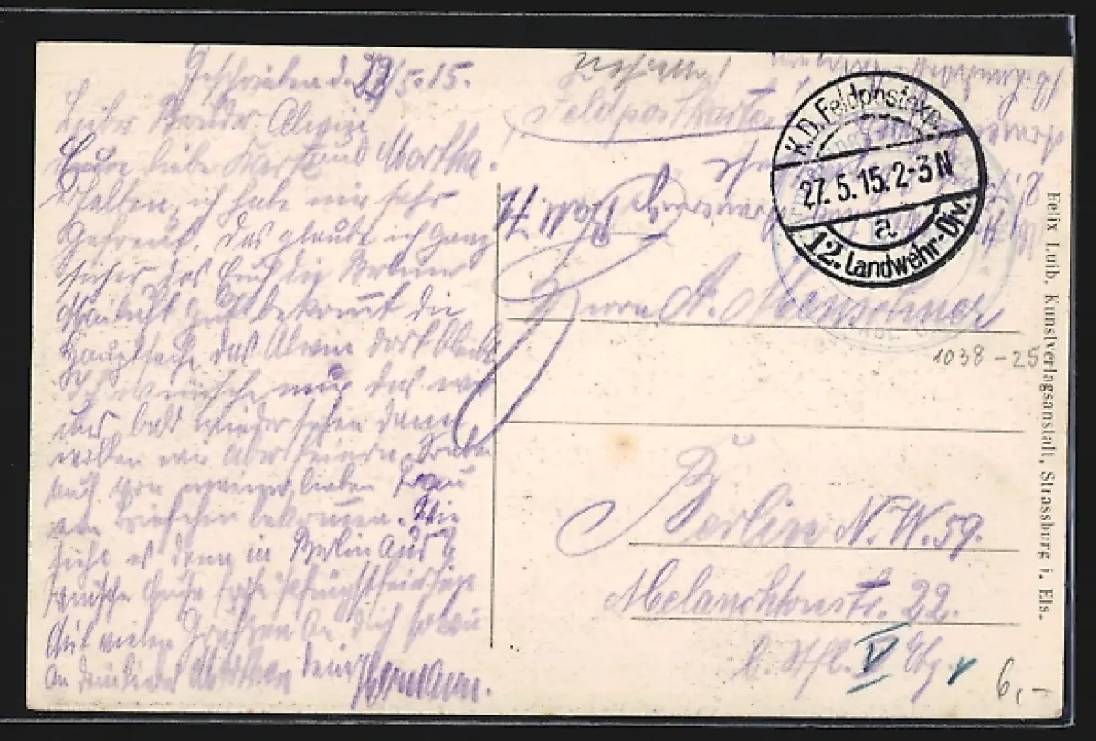 Personenbezogene Daten auf der Rückseite der Karte wurden durch blauen Textmarker unkenntlich gemacht. Die blauen Stellen sind auf die Vorderseite durchgeweicht und wirken sich negativ auf das Postkartenfoto aus