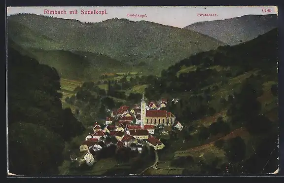 AK Rimbach mit Sudelkopf, Teilansicht mit Kirche, Sudelkopf und Firstacker