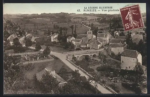 AK Rimeize, Vue générale du village avec pont et campagne environnante