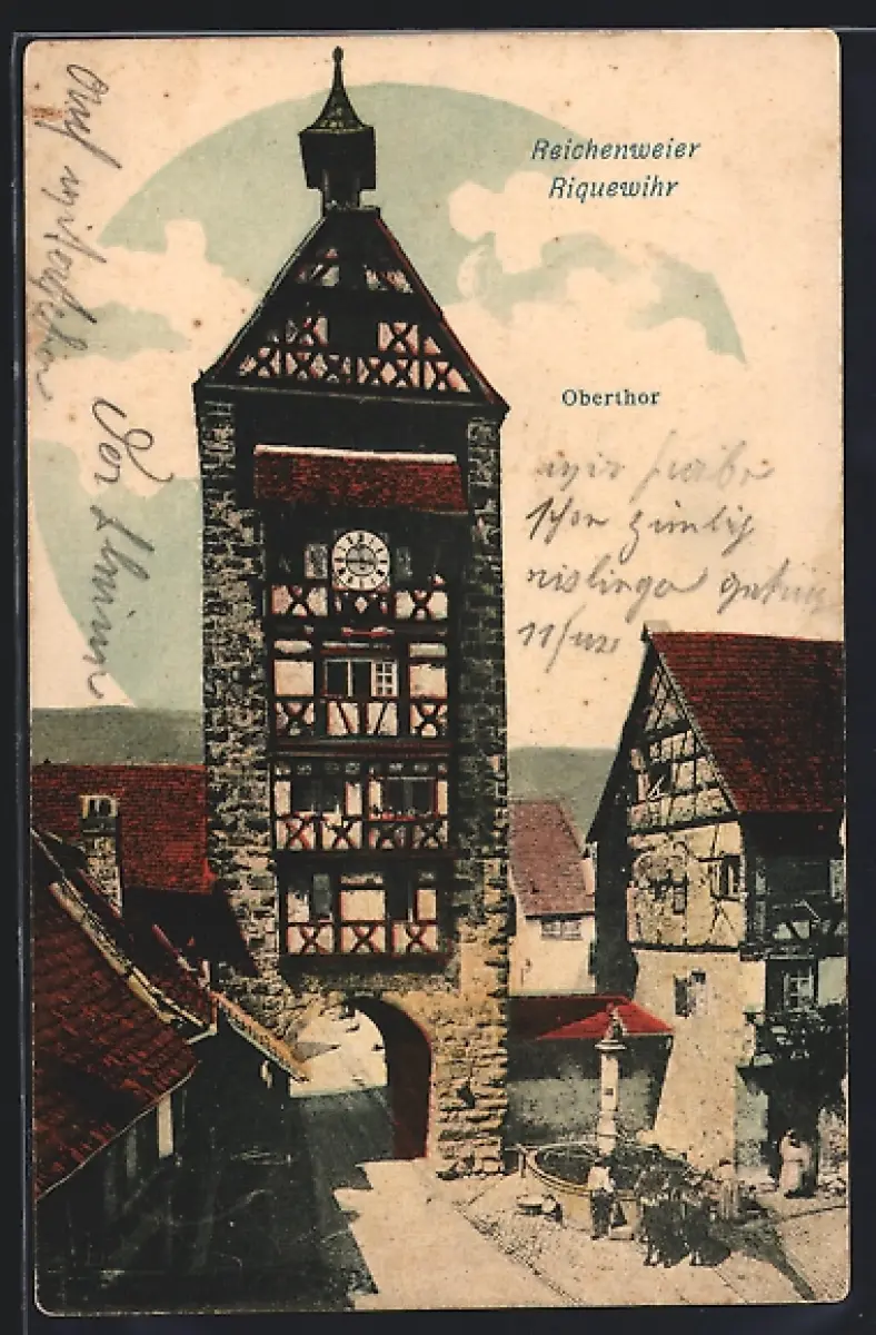AK Riquewihr, Oberthor et vue de la rue pavée avec maisons à colombages