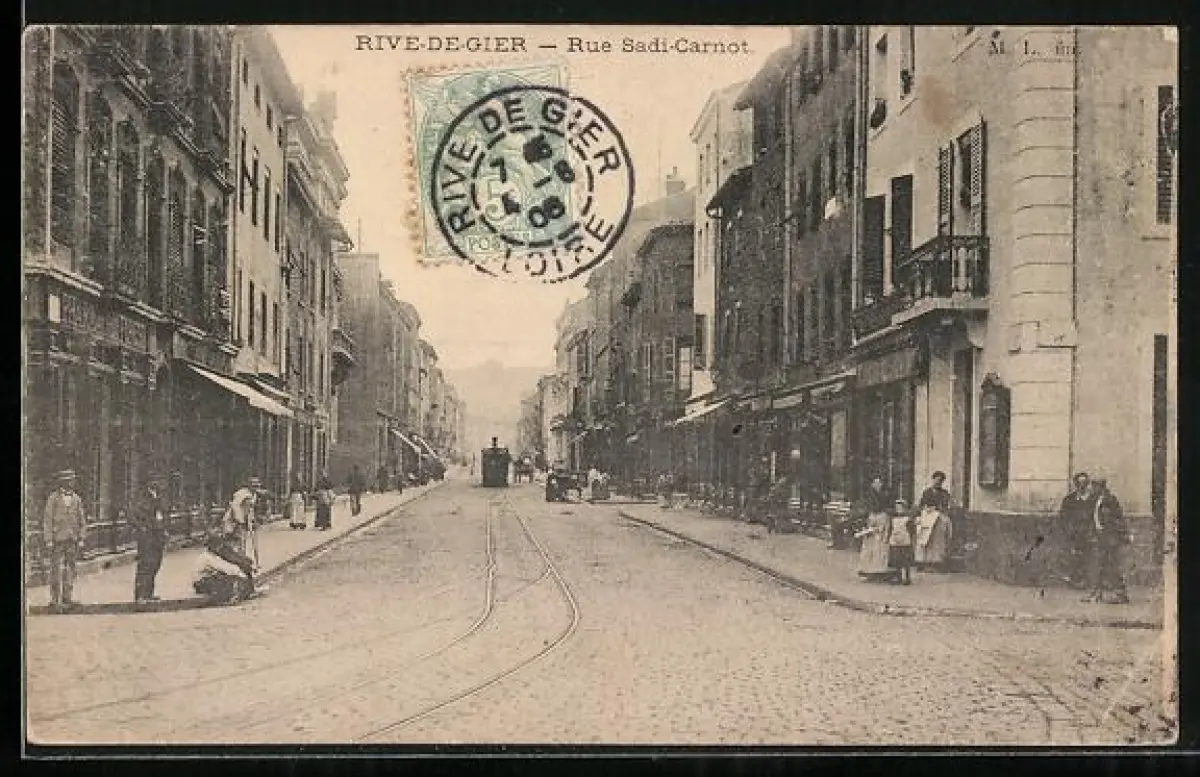 AK Rive-de-Gier, Rue Sadi-Carnot avec passants et rails de tramway