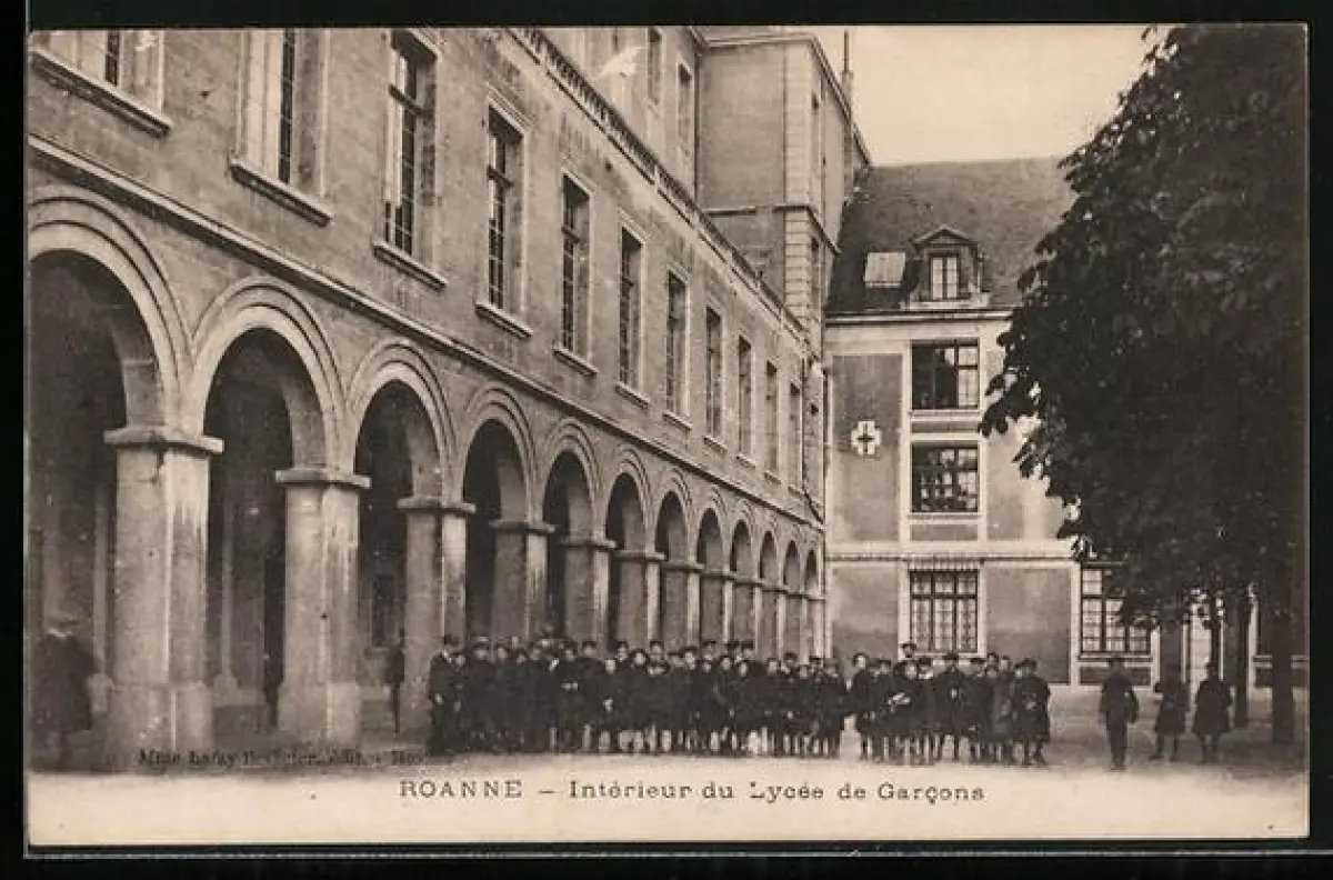 AK Roanne, Intérieur du Lycée de Garcons avec élèves rassemblés devant les arcades