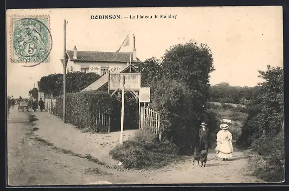 AK Robinson, Le Plateau de Malabry avec promeneurs et chien devant un café