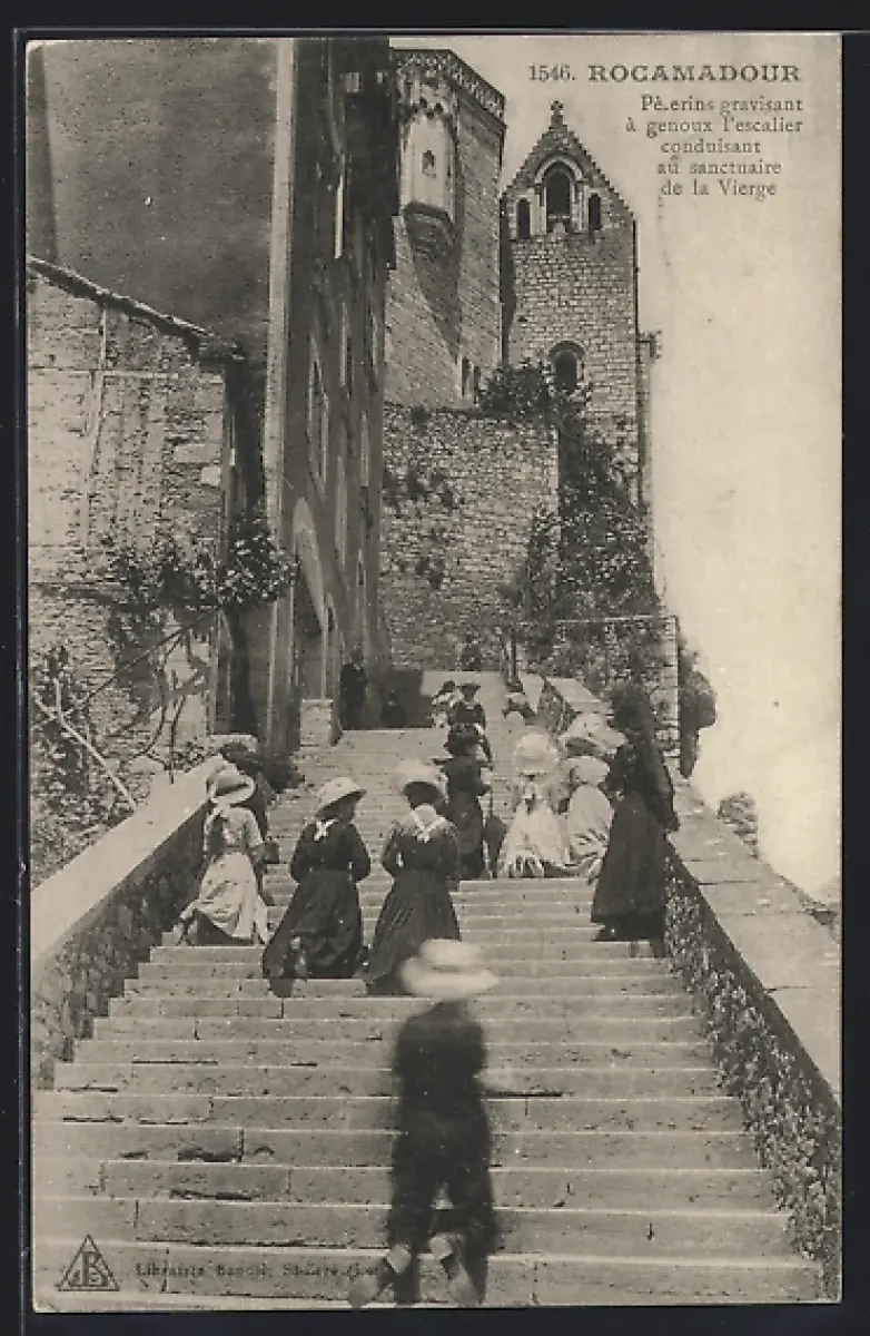 AK Rocamadour, Pèlerins gravissant les escaliers conduisant au sanctuaire de la Vierge