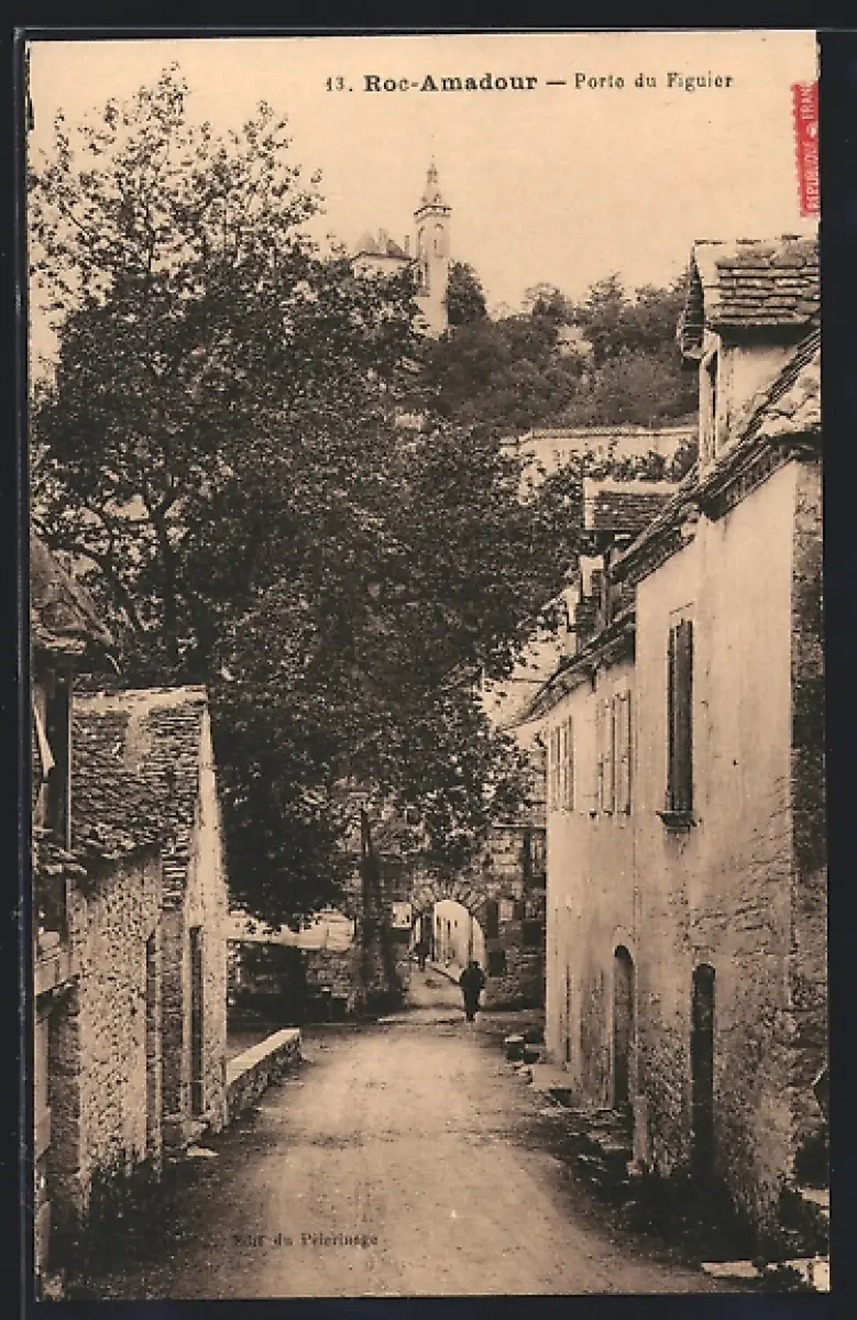 AK Rocamadour, Porte du Figuier et vue sur la chapelle en arrière-plan
