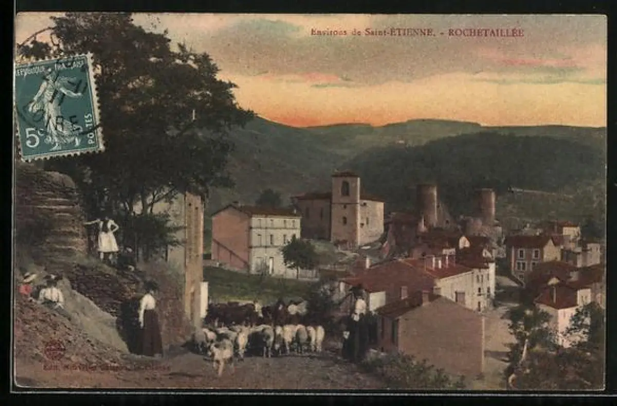 AK Rochetaillée, Vue du village avec troupeau de chèvres et collines en arrière-plan