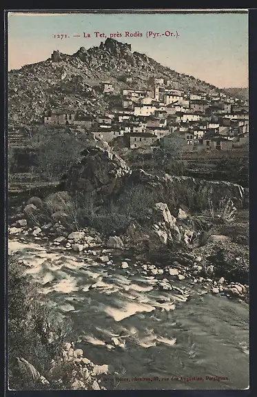 AK Rodès, Vue de la Têt et du village pittoresque sur la colline