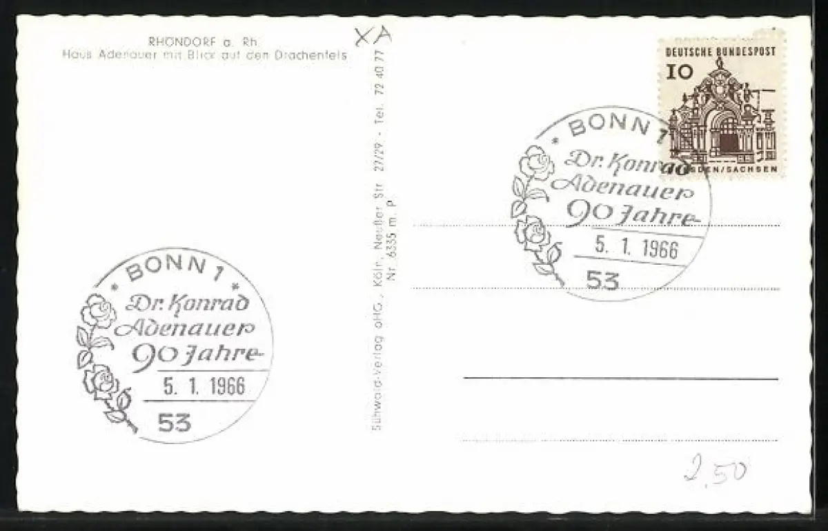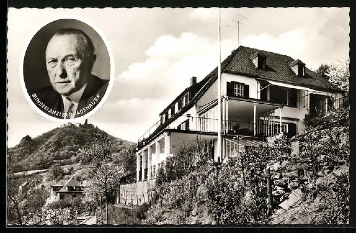 AK Röhndorf, Haus Adenauer mit Blick auf den Drachenfels, Portrait von Adenauer