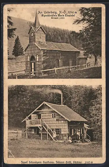 AK Rohr im Gebirge, Unterberg, Josef Schweigers Gasthaus, Bes. Johann Grill, Alpenkirchlein Marie Einsiedel