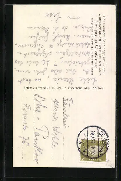 Personenbezogene Daten auf der Rückseite der Karte wurden durch blauen Textmarker unkenntlich gemacht. Die blauen Stellen sind auf die Vorderseite durchgeweicht und wirken sich negativ auf das Postkartenfoto aus